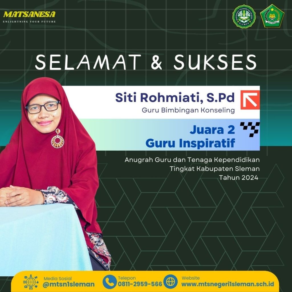 Siti Rohmiati dikenal karena pendekatan empati dan dedikasinya dalam membimbing siswa, baik dalam akademik maupun pengembangan karakter. Prestasi ini semakin mengukuhkan MTsN 1 Sleman sebagai madrasah berprestasi di Kabupaten Sleman.(Sym)